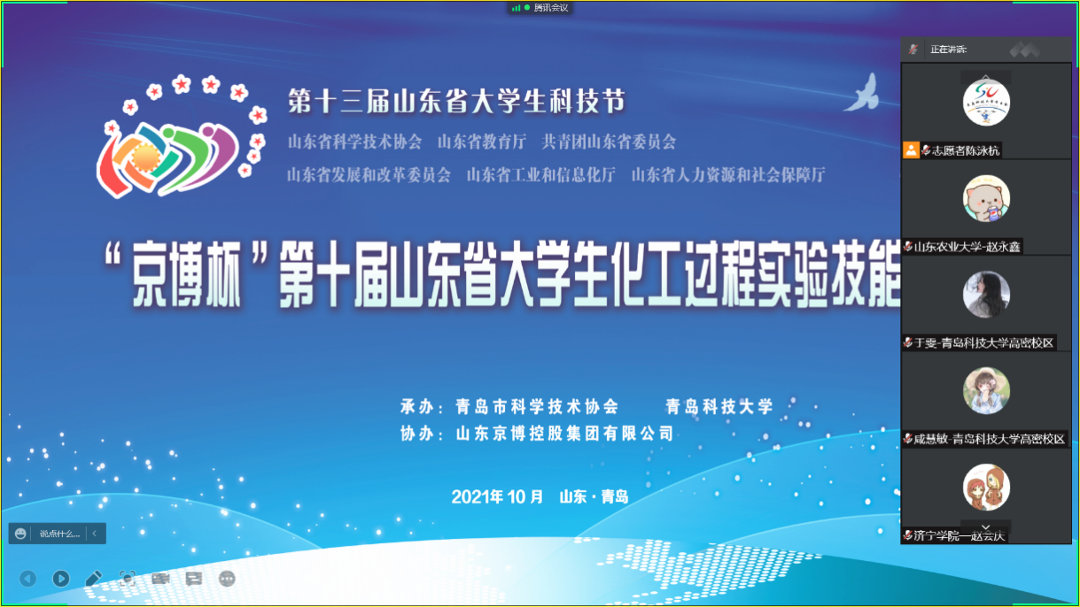 在竞赛期间,由山东省大学生化工过程实验技能竞赛委员会、化工过程国家级实验教学示范中心(青岛科技大学)联合主办的“全省化工专业一流课程线上教学研讨会”在10月31日下午召开。受组委会邀请,里番