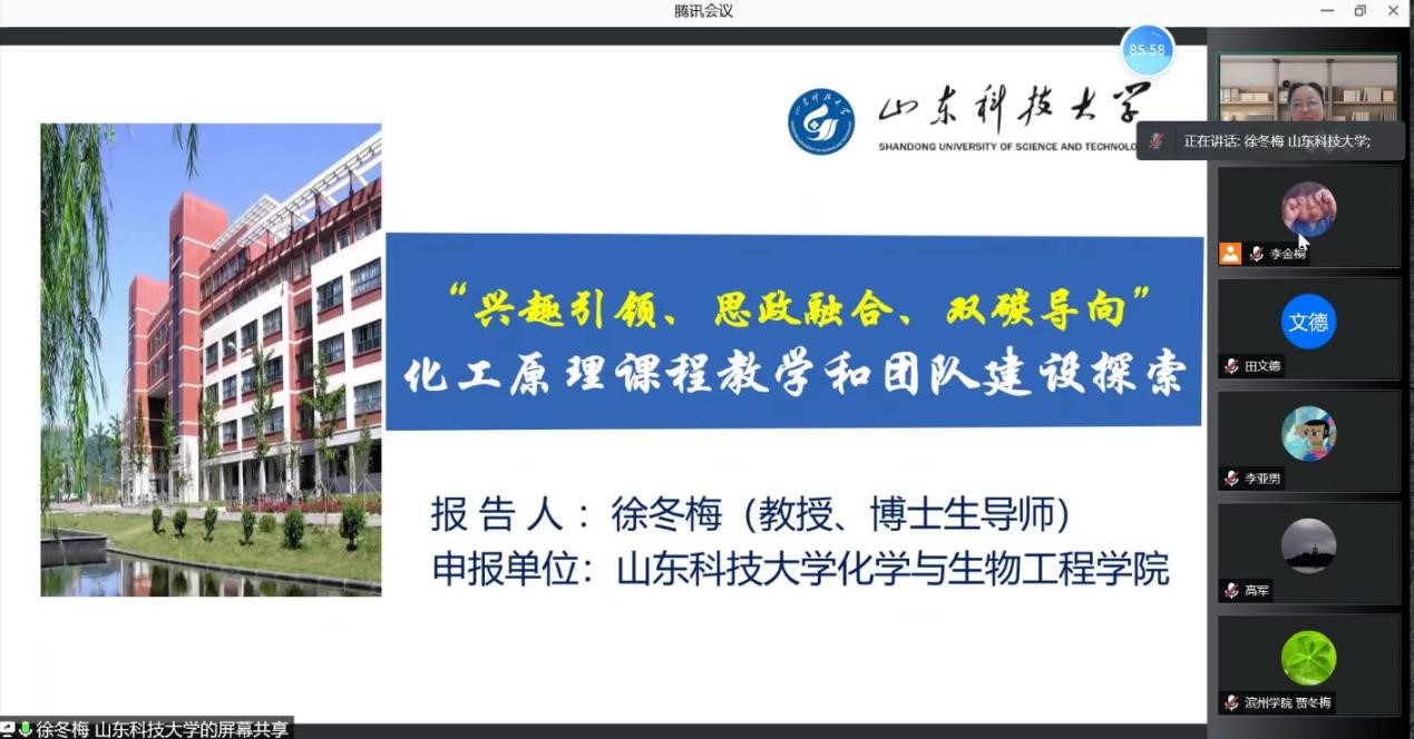 徐冬梅教授在会议上作了题为“兴趣引领、思政融合、双碳导向”化工原理课程教学和团队建设探索的一流课程建设专题报告,和参会的50多位专家分享了我校在化工原理课程和一流课程建设方面的成果和经验,取得了良好的交流效果。
