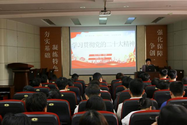 田静从党的二十大召开情况引入,从多个方面强调了学习宣传贯彻党的二十大精神的重大意义。在讲解到党的二十大主题时,她指出,要全面准确领会党的二十大精神,首先要深刻领会党的二十大主题。随后她从党在过去五年的工作和新时代十年的伟大变革方面向同学们进行讲述,新时代十年的伟大变革离不开改革开放和社会主义现代化建设取得的巨大成就,使同学们对相关方面的知识有了更深刻的领悟。在向同学们讲述新时代新征程中国共产党的使命任务时,她着重强调了“坚持发扬斗争精神”,学真本事,长真才干,将所学知识内化于心,外化于行。讲述过程中,田静书记联系实际、联系生活,以身边的具体事例来帮助同学们更好的理解二十大报告内容。