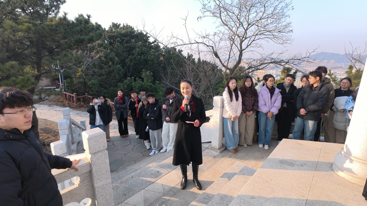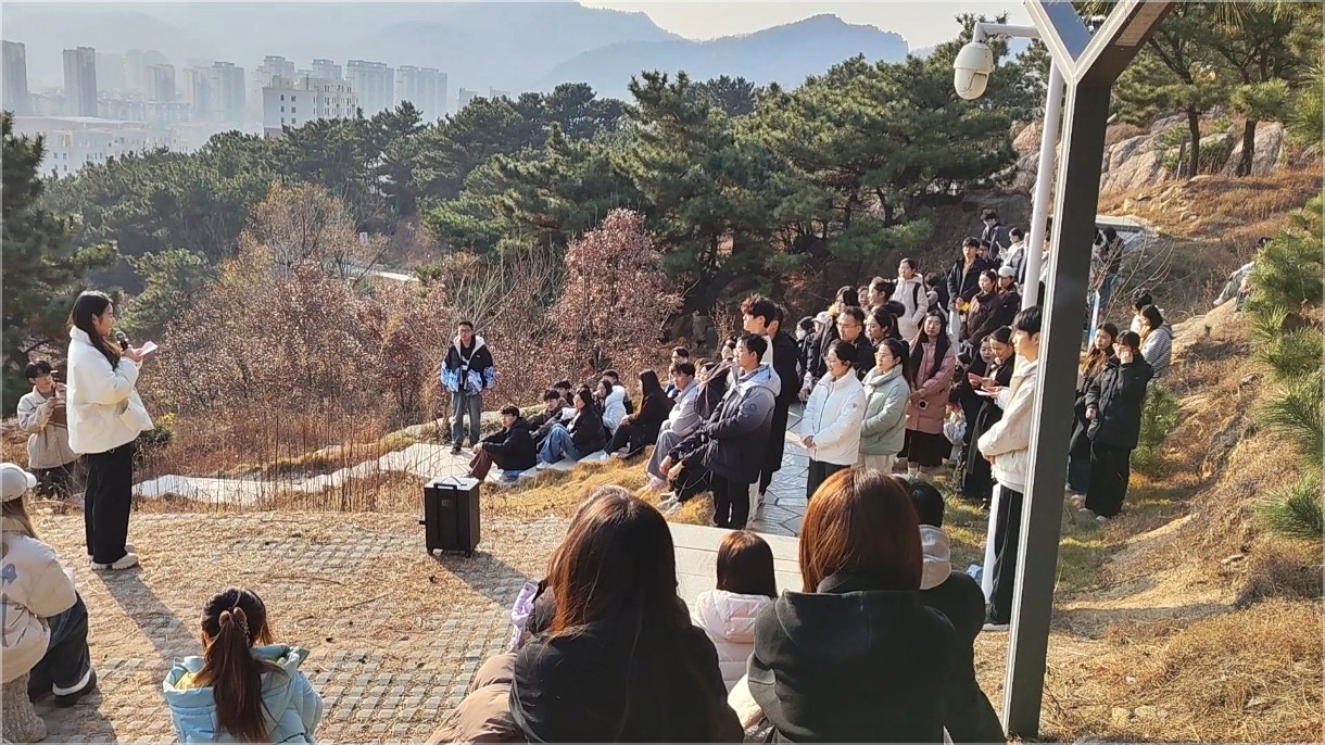 活动尾声,全体师生俯瞰美丽的山科校园,遥望巍巍群山,聆听优秀本科生代表姜昕彤演唱经典爱国歌曲《我爱你,中国》。当歌声与松涛相合,在场师生的情感也随旋律而升华,动情处即随之齐唱,悠扬婉转的歌声在山间回响,爱国爱校的美好情愫在师生心中萦绕,课程也进入了尾声。最后,易凡总结指出,“一二·九”运动彰显了“我先上”的爱国勇气,松柏精神代表着“压不垮”的担当脊梁。她勉励青年学子将“朝乾夕惕”作为日常修行,以“挺膺担当”回应时代召唤,把“矢志复兴”融入终身使命。