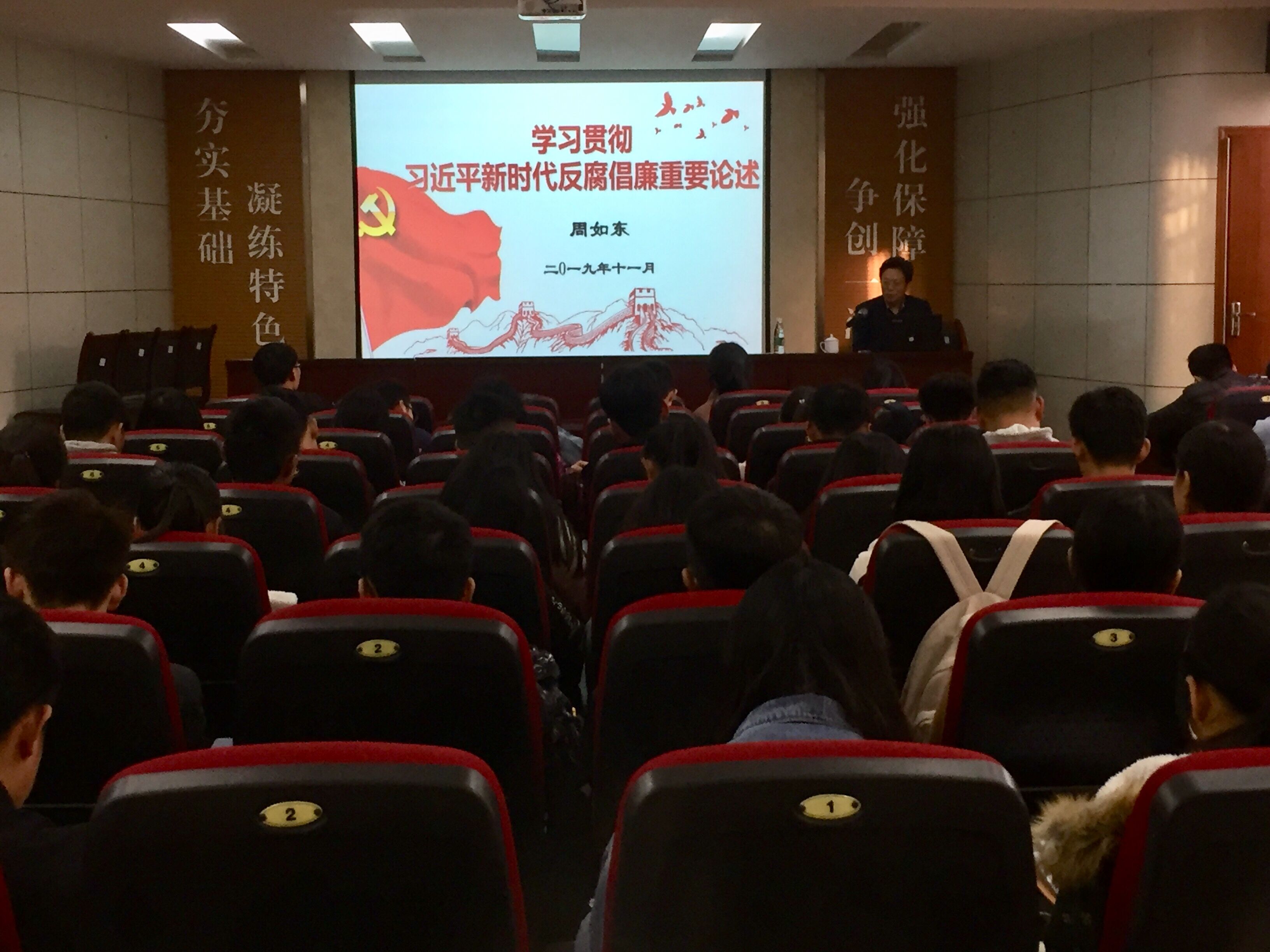 周如东从对新时代反腐倡廉形势的判断、习近平新时代反腐倡廉重要论述及其价值等方面进行了详细讲解。他系统分析了2013年至今国家反腐倡廉的严峻复杂形势,结合真实案例,深刻地阐释了反腐倡廉的意义、作用、四种形态、如何贯彻等问题。他强调党员发展对象要从学生时期树立不敢腐、不能腐、不想腐的信念,做反腐倡廉的拥护者。(申硕)