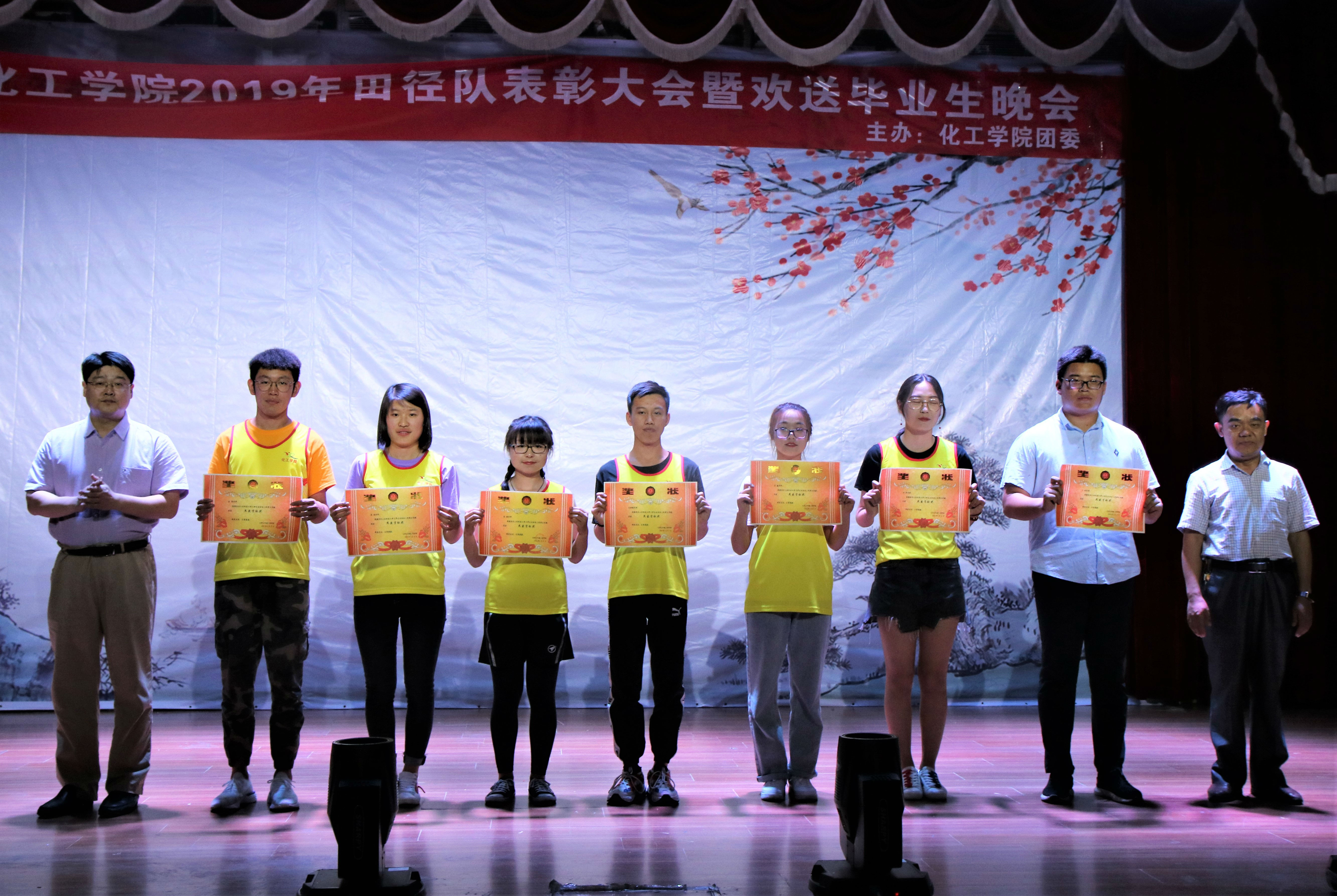 在大学生活动中心二楼报告厅举行2019年田径队表彰大会暨毕业生欢送晚会。校团委书记尹立明、校学生处副处长卞西春、体育学院副院长杨彤彤、里番