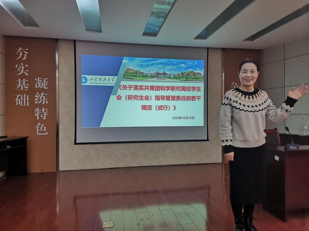 学生干部学习系列课程---《关于落实共青团和学联对高校学生会(研究生会)指导管理责任的若干规定(试行)》。团委书记易凡主讲,学生会,研究生会全体成员参加了此次会议。