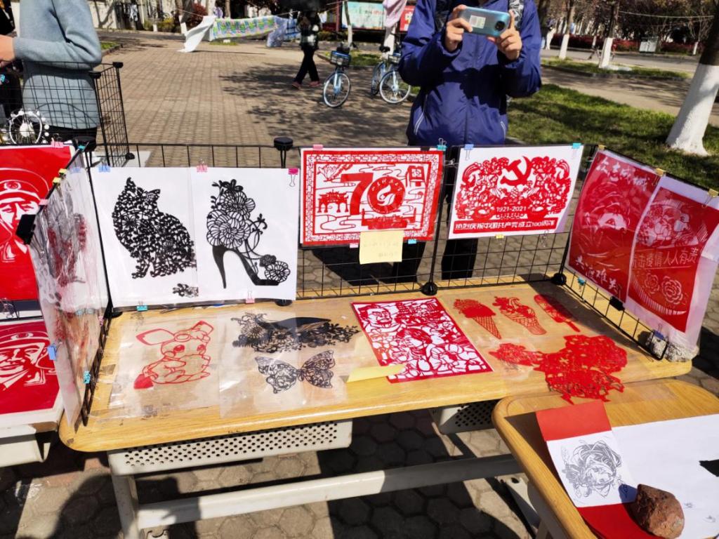 刀下飞花剪纸社在繁星广场举办手工艺品展览活动。里番