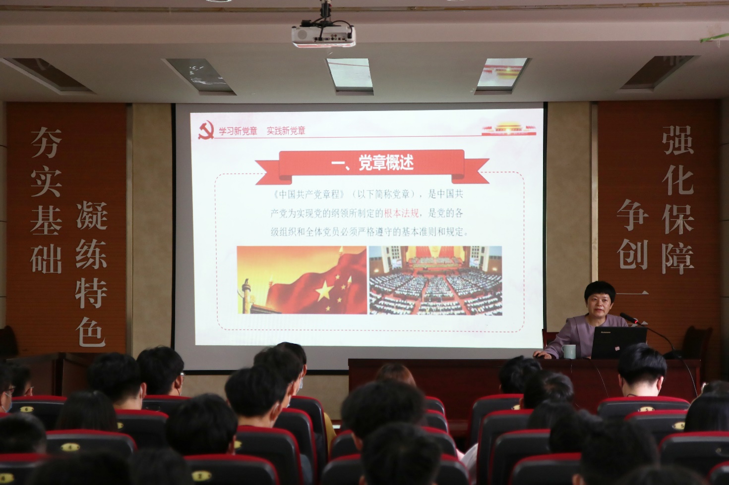 田静首先带领学员们一起学习了习近平总书记关于学习党章的重要指示精神,希望学员充分学习领悟党章的定义及组成部分,加强党性锻炼,提高党性修养。她指出,党章是管党治党的总章程,对党员有十分重要的意义,每一名党员都要认真学习党章,遵守党的纪律,践行群众路线,继承和发扬党的优良传统。随后她列举并解读了新党章中增加的部分内容,强调了“全面从严治党”、“四个意识”写入新党章的重要性。她说到,党章的变化展现的是社会时代的变化,我们都应该深刻认识社会的变化与进步,切实加强自身思想道德建设,发挥党员先锋模范作用。