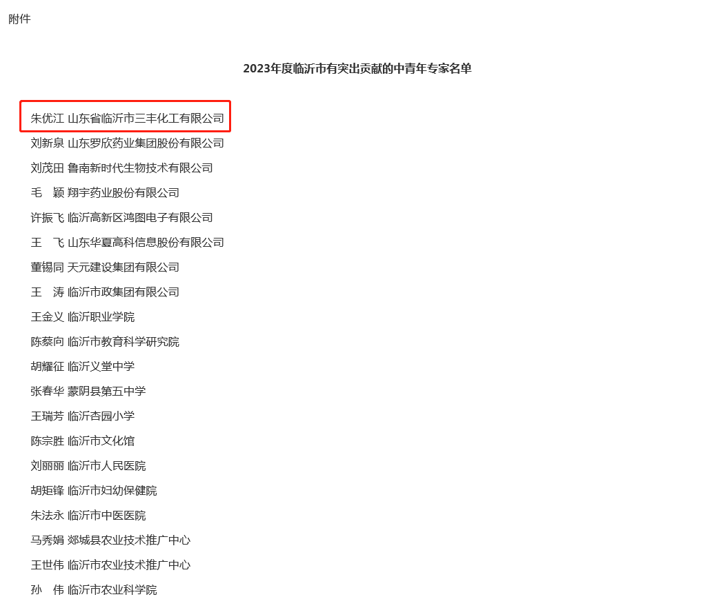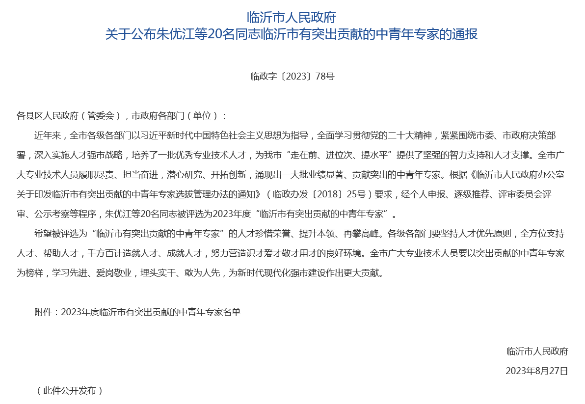 近日,山东省临沂市政府印发《关于公布朱优江等20名同志临沂市有突出贡献的中青年专家的通报》(临政字〔2023〕78号),我院2003级生物工程专业校友朱优江被评为“临沂市2023年度有突出贡献的中青年专家”。
