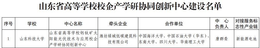 近日,山东省教育厅、山东省工业和信息化厅公布了山东省高等学校校企产学研协同创新中心建设名单,由里番 唐群委教授担任中心负责人的山东省高等学校钙钛矿太阳能光伏技术与应用校企产学研协同创新中心获批成立。