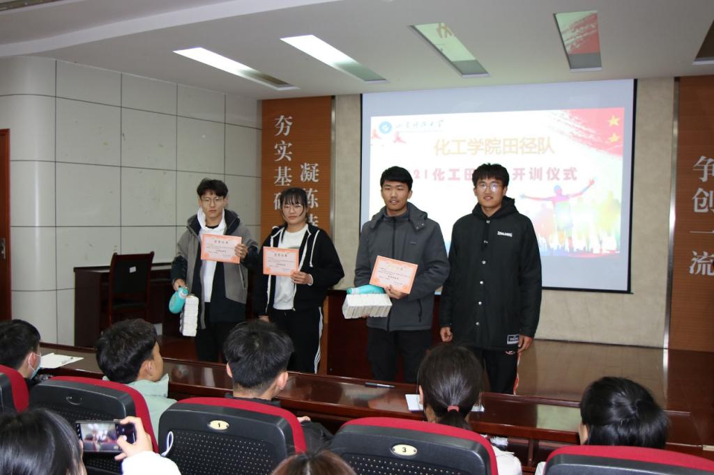 会议首先对在寒假期间举办的“运动达人化身宅家厨神”、“宅家运动季”等活动中表现突出的队员进行了表彰奖励,上任田径队总教练任晓聪、老队员代表牛纪达为获奖者颁发奖品。