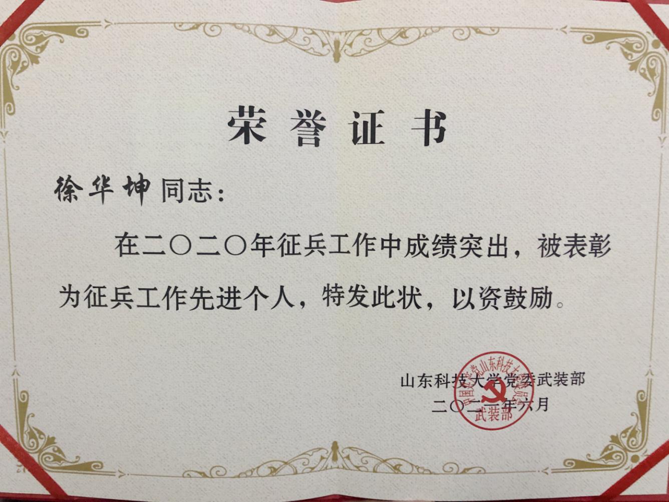辅导员徐华坤荣获“2020年度征兵工作先进个人”称号。