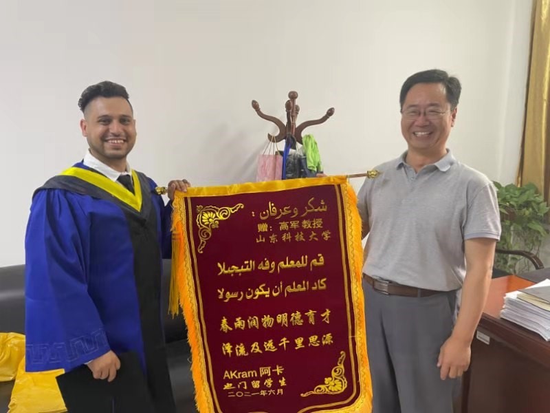 攻读化学工程与工艺专业本科,2018年考取本院化学工程与技术专业研究生。Akram为人友善,勤奋好学,与国内学生交流密切,主动联系老师请教问题,科研能力较强,硕士期间发表SCI论文一篇,硕士毕业论文外审成绩优异,即将进入中国科技大学攻读博士学位。Akram表示,自己非常喜欢中国,喜欢青岛这座城市,喜欢科大的学术氛围和校园环境,在这里遇到了一群和蔼的老师和善良的同学,十分感激高老师对自己学业和生活的帮助和指导,因此想通过送锦旗这一具有中国特色的方式来表达内心的感谢。