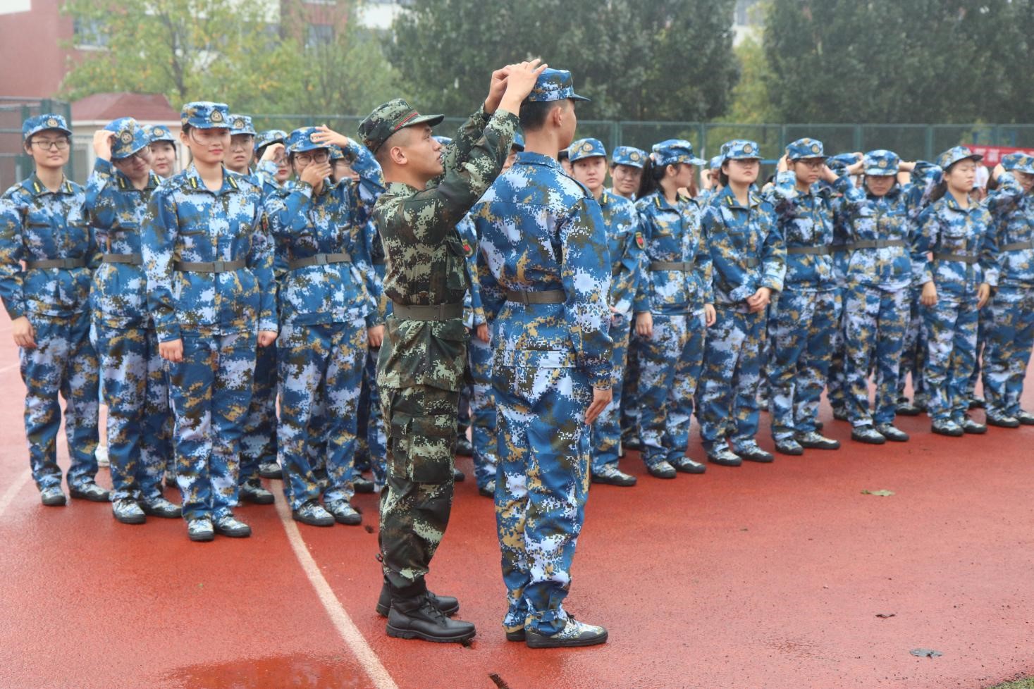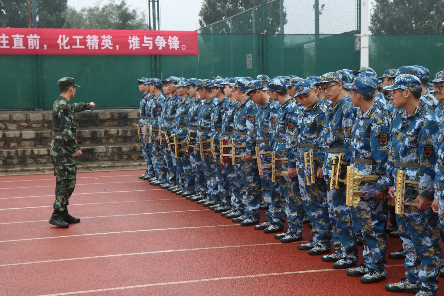 2021级新生军训开训典礼在风雨操场拉开帷幕。化工学子着迷彩军装,整装列队,以饱满的精神面貌迎接大学军训的第一天。