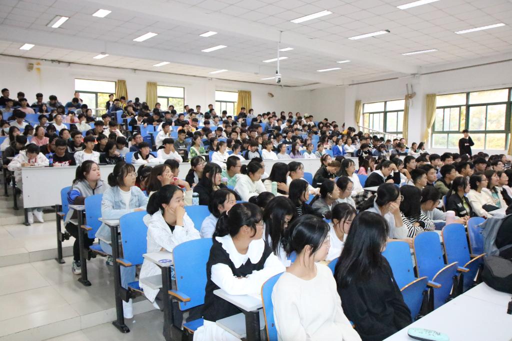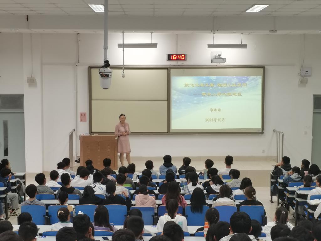 在J1-228举办新生入学适应心理专题讲座,讲座由学院心理健康教育负责老师李玲玲主讲,全体大一新生到场聆听。