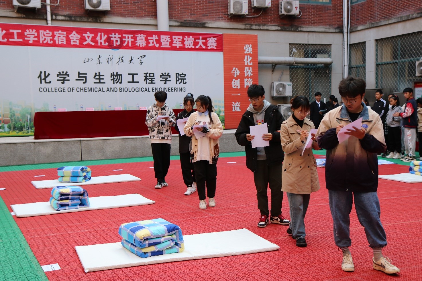 此次比赛共分为四轮:针锋相对(个人叠被),黑夜作战(蒙眼叠被),男女搭配、干活不累(合作叠被),眩晕大作战(旋转后叠被)。比赛开始,各班代表队喊出响亮的口号将全场的气氛带入高潮。参赛选手斗志昂扬,一床床松软的棉被在他们手中变成一个个“豆腐块”,现场观众为支持的队伍呐喊助威,游戏环节更是为比赛增添了欢乐与轻松,现场气氛热烈。