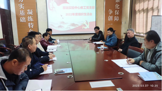关于召开2022年度党支部组织生活会和开展民主评议党员、党支部书记抓党建述职评议、党支部评星定级工作的通知》的安排,3月7日,基础实验中心教工党支部召开“凝心聚力,统一思想,深入学习贯彻党的二十大精神”专题组织生活会,并开展了民主评议党员工作。会议由党支部书记崔科同志主持,院长吕宪俊同志对会议进行了指导和点评,学院专职组织员王大鹏同志列席会议,支部全体党员参加了会议。