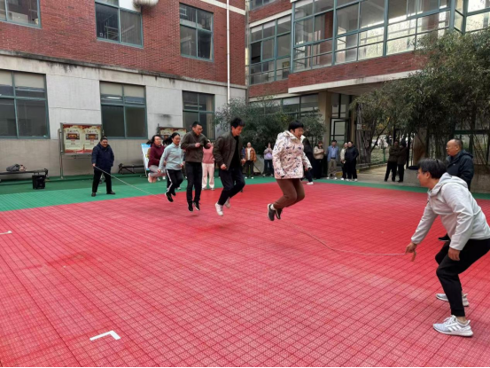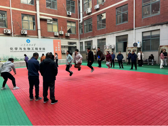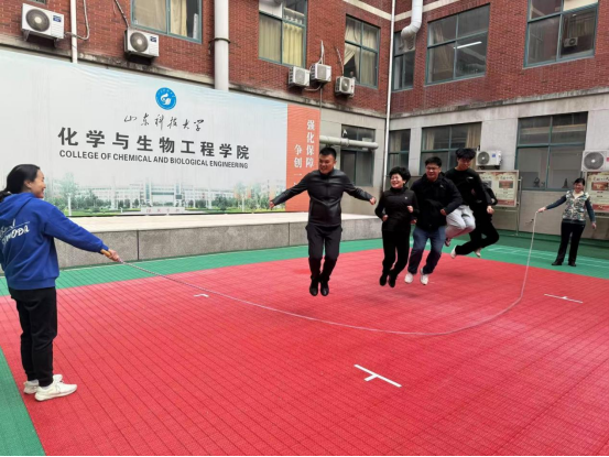 本次活动共有5支队伍参赛:应化队、化工队、生工队、机关队、实验中心队。每队7名队员,2人负责摇绳,5人跳绳,比赛时长每队3分钟,以3分钟内完成的次数进行排名。老师们有序排好,随着绳子有节奏地甩动,迅速找准时机起跳。绳子在空中快速飞舞,队员们鱼贯而入,配合默契,展现出了极佳的节奏感和团队协作能力。大家一个接一个轻松跃过,如同灵动的音符在绳间跳跃,彰显出良好的身体协调性和控制力。场外的加油声、欢呼声此起彼伏,为参赛选手们注入源源不断的动力。经过紧张又激烈的角逐,机关队凭借出色的团队协作以及稳定的发挥,在众多队伍中脱颖而出,一举夺冠。