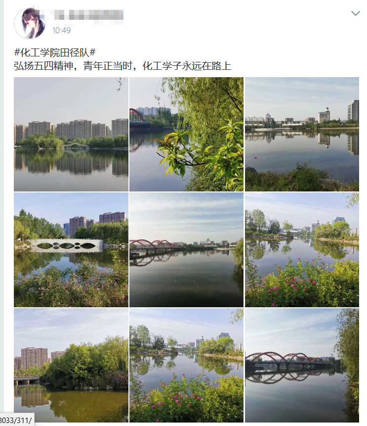 团日活动采取户外奔跑打卡的方式进行,支部成员用奔跑诠释青春活力,用镜头记录家乡的美丽风景,用行动去感染带动身边的人,在QQ空间、朋友圈等平台分享奔跑口号和照片。从自然风光到科技新象,我们感受着不同地域文化与景观的多样化,见证着团员青年们的激情与朝气。大家在奔跑中既保持了基本训练强度,也体会着奔跑的意义,正是一代又一代青年人的努力奔跑,让曾经落后的中国如今冲在了世界的前列。作为新时代青年,更要继承和发扬“五四精神”,奔跑永不止息。