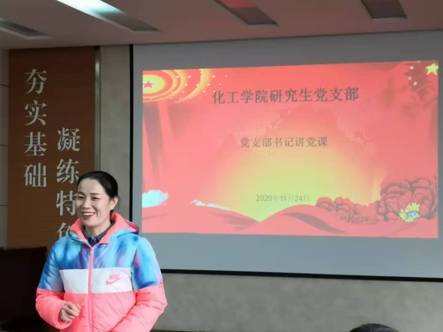 研究生党支部书记易凡在J2-104为支部成员讲党课。党课的主要内容是“深刻理解党的十九届五中全会精神”,里番