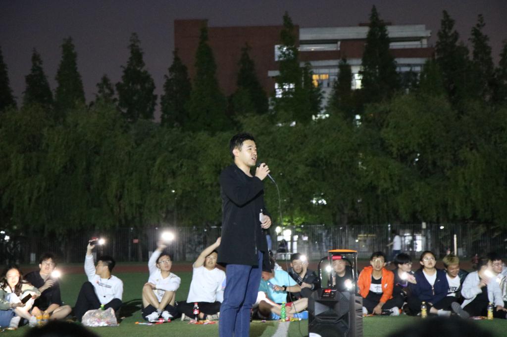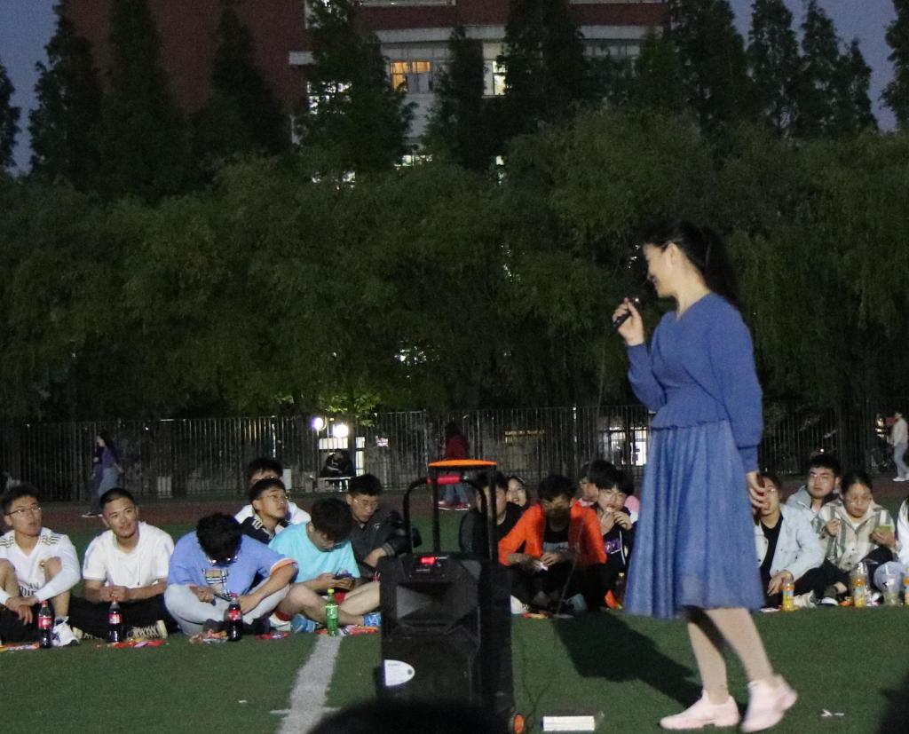 在之后的表演环节中,到场的老师给大家带来了重重惊喜:2020级辅导员满灏老师献唱《没有共产党就没有新中国》和《奔跑》,伴随着同学们的自发合唱和热烈掌声,让同学们不由得惊呼“今天看到了不一样的满老师,但都是一样的贴心满满”;2019级辅导员李玲玲老师为大家带来《打靶归来》和《最浪漫的事》,第一首的激昂动听歌声让同学们想起了战士打靶的场景,第二首更是唱出了全体辅导员的心声:“我能想到最浪漫的事,就是和你们一起慢慢变老……”;随后,易凡老师一首气势磅礴的《精忠报国》,让在场同学禁不住回想起近代百年的中国史,跟着她一起唱出了青年学生精忠报国的热情,并一起喊出了“化工化工谁与争锋”的运动会口号,掀起一个小高潮;最后,2018级辅导员徐华坤老师演唱《踏山河》,全体同学倾情跟唱并打开手机手电筒左右摇摆------一百多部手机的熠熠光芒与天上的闪烁星光遥相呼应,歌声、星光和掌声不仅让到场师生倍觉幸福美好,而且惊艳了风雨操场的所有行人。一位来自塔吉克斯坦的大二留学生被歌声感动驻足不愿离去,主动提出为大家唱首歌,主持人以中国人特有的热情友善把他请到圈中,他满含柔情地为大家演唱了一首英语歌曲《PERFECT》,给这场红歌会带来了异国情调和别样惊喜。