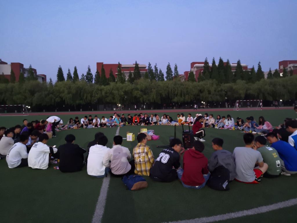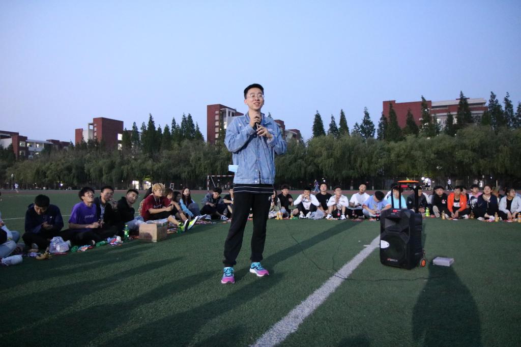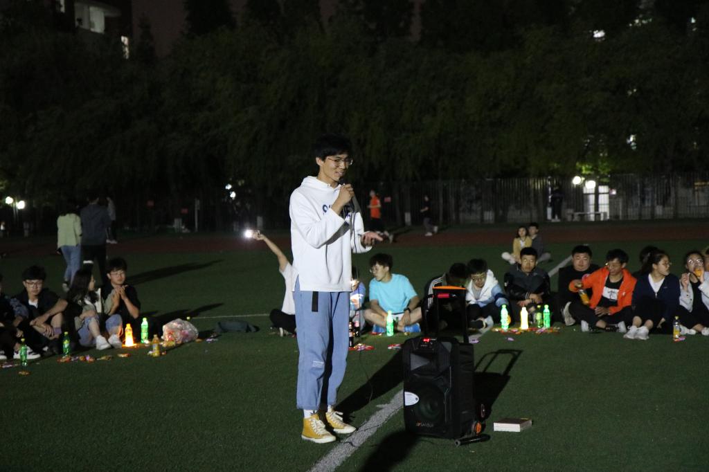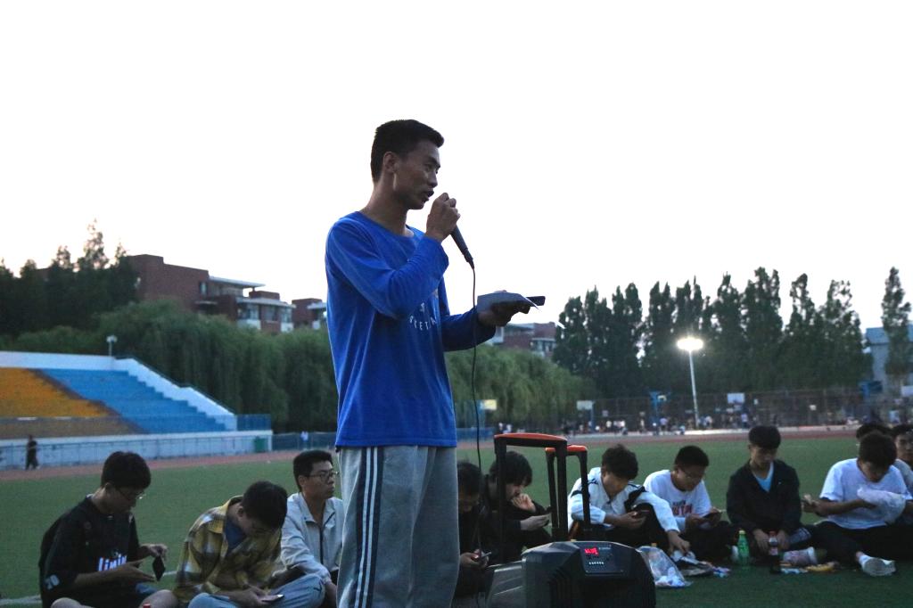 夜幕初起,老师和同学们在谈笑之间围成了一个圈,把圆圈中间作为舞台。19:00,主题团日活动开始,主持人李彦钊首先发表了一段关于本次校运会再获双冠暨甲组十连冠乙组十年九冠的总结,他的讲述激情澎湃,引发同学们回忆起一周前的运动会,激发了大家的真情共鸣。随后,他请出了为运动会提供主力后勤保障服务的里番