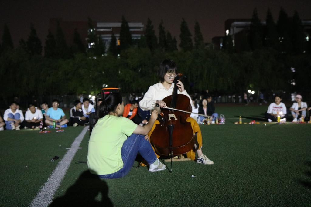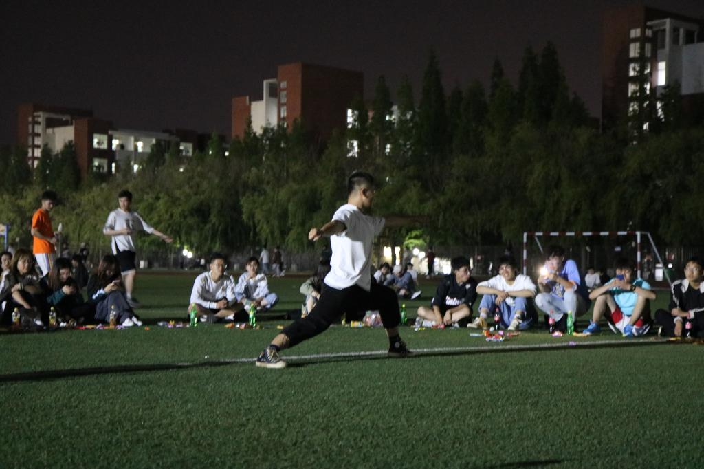 留学生表演结束后,主持人宣布团日活动进入团支部成员表演环节,团支部成员孙铭泽大提琴独奏《lemon》《我和我的祖国》,悠扬的琴声随着夜风,流进了每一个人的心里;王阳为大家带来的太极拳、白雪晴等四人展示的少林长拳 ,让同学们不由得感叹中华武术的博大精妙;随后,田径队团支部全体成员合唱《朋友》和《里番