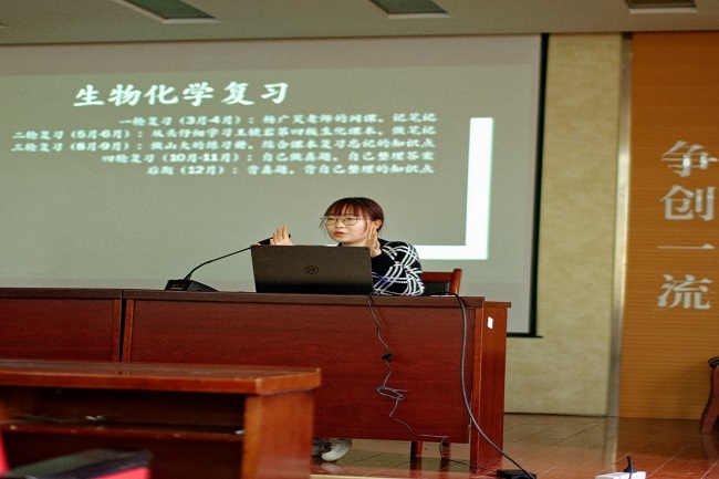 下午4:00,活动正式开始。主持人开始主持活动,说明当前考研形势的严峻以及此次活动举办的重要意义。随后,第一位活动演讲者是生物工程2018级2班的田景睿同学,她成功保研考取天津大学合成生物学专业。在演讲中,她就保研经历以及需要准备的资料进行了详细介绍,充分说明了对考研院校和专业选择的个人见解,分享了很多宝贵的考研经验。演讲结束,全体学生热烈鼓掌!第二位活动演讲者是生物工程2018级2班的王坤东同学,她在今年成功被录取中国海洋大学生物技术与工程专业。她主要在考研各科怎样复习,以及如何有计划进行复习的方面给同学们进行了详细说明,介绍了英语单词与考试真题对考研的重要性,还列出了考研阶段的作息时间,为同学们提供了很多宝贵的经验。第三位活动演讲者是生物工程2018级2班的徐心怡同学,她成功被中国科学技术大学生物与医药专业录取。她帮助同学们推荐了专业参考书和教材,方便同学们备考选择教材时避雷,同样也分享了如何高效复习的经验。同学们掌声雷动!第四位活动演讲者是生物工程2018级2班的高趁霞同学,成功保研进入山东大学生物与医药专业。在考研专业复习上提出了阶段性复习的建议,介绍了自己确定考研院校的经历,帮助了同学们怎样更好地选择院校。最后,主持人发言,活动结束。