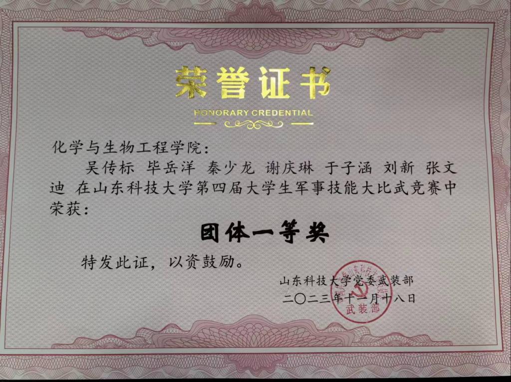 在学校第四届大学生军事技能大比武竞赛中荣获团体一等奖。学子吴传标、毕岳洋、秦少龙、谢庆琳、于子涵、刘新、张文迪代表里番