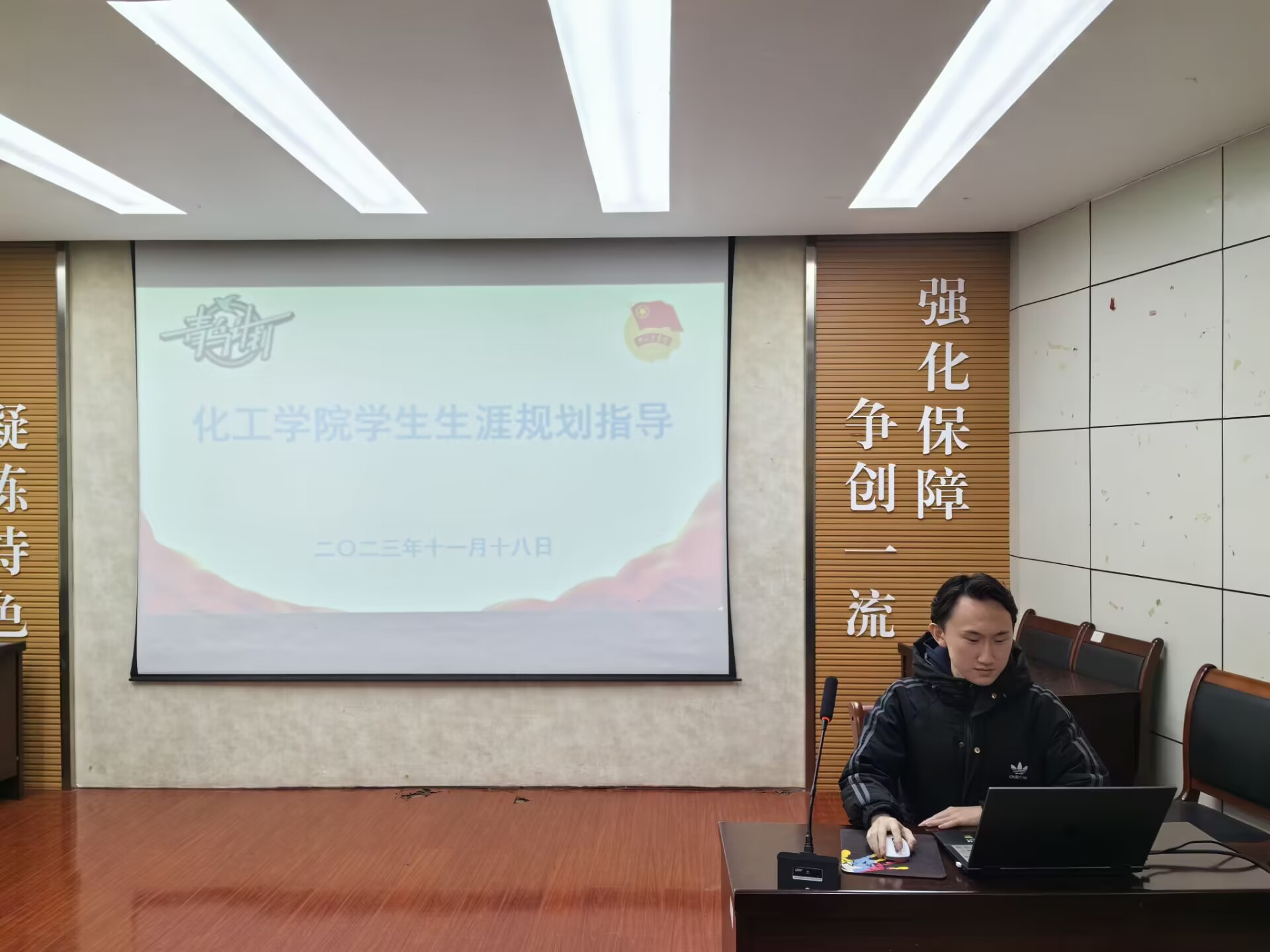 举办学生生涯指导讲座。会议由辅导员满灏老师主持,由保研至山东大学、应化20-2班臧霄奉同学担任主讲,里番