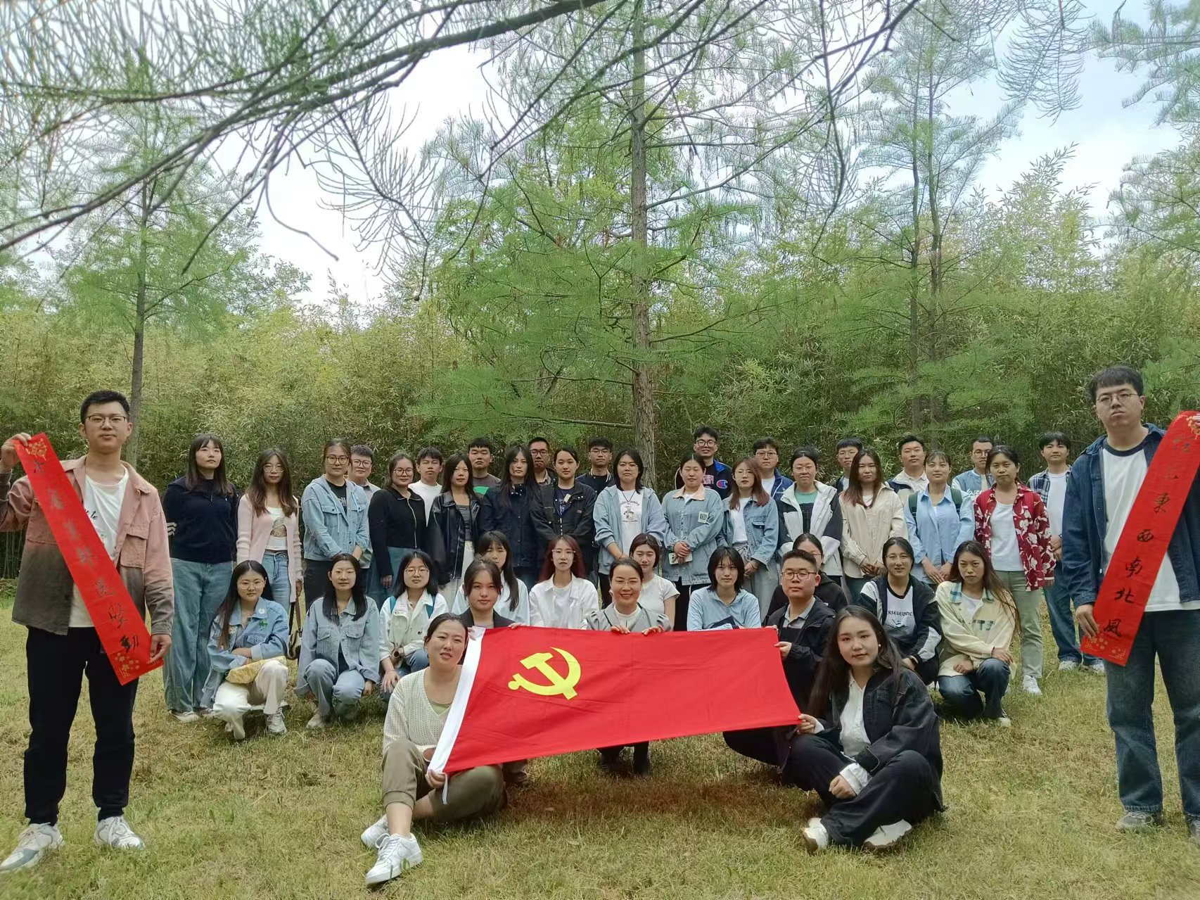 研究生党支部全体党员到达徽竹园后,易凡老师简要说明了这次党课是本支部创新型党课《嵙景观思政课》系列党课的第一讲,随即宣布课程开始。她先以我嵙青岛校区校史中关于徽竹园的来历切入话题,并从正反两个方面展开对于竹子的植物特性及其思政启迪的讲述。首先,她从正面角度出发,向各位党员阐述了“竹子定律”的内涵,即竹子用4年时间仅仅长了3厘米,但从第五年开始会以每天30厘米的速度疯狂生长,只用6周的时间,就会长到15米。看起来好像竹子前面4年没做什么,但这4年里,竹子将根在土壤里延伸了数百平米,这就是竹子定律。随后,她话锋一转,用重温毛主席经典文章《改造我们的学习》的方式,从反面出发,告诫各位党员,在学习中要警惕“墙上芦苇,头重脚轻根底浅,山间竹笋,嘴尖皮厚腹中空”的态度,由此勉励全体研究生党员要在科研的沃土中“扎根”钻研,戒骄戒躁,以期厚积薄发,学有所成。最后,支部党员在易凡老师的带领下进行“竹”主题诗词“飞花令“,40名党员参与了这个游戏。在支部党员的朗诵接龙过程中,大家一同回顾了40首中国古代写竹诗词名篇,深深折服于传统文化的简洁典雅之美。活动结束后,支部全体党员一起拍照并录制视频留念。