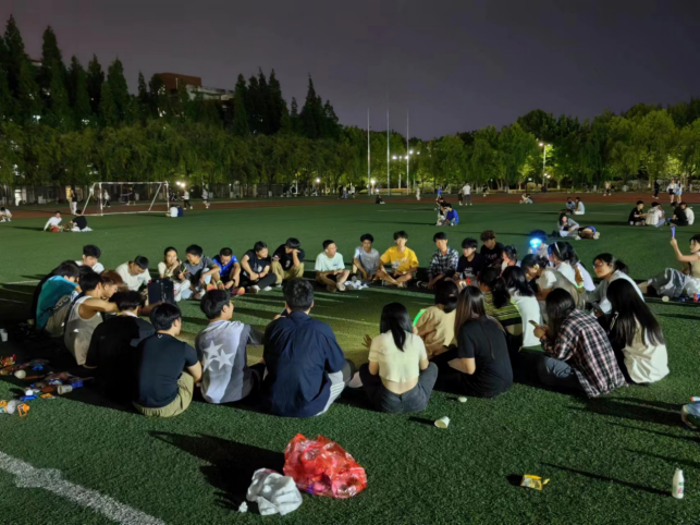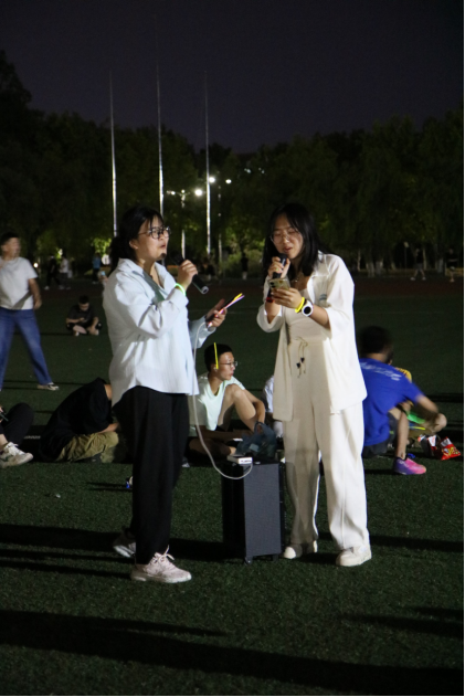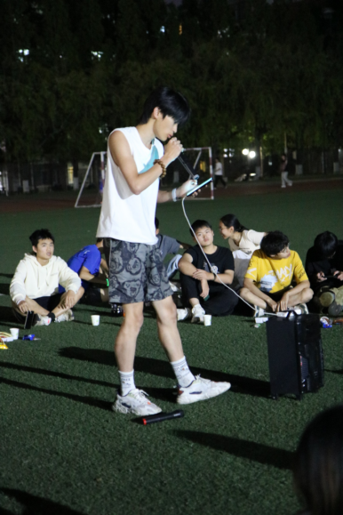 队员们席地而坐,在草坪上围成一个圈,把中心位置作为舞台。团支书王浩林在简短的致辞中谈到:2023-2024赛季已经结束,不管是冬季越野赛的双冠,还是校运会的五冠,所有的成绩是都是学院党委领导田径队当团支部所有队员共同努力的结果,现在起,我们要继续以昂扬的斗志和饱满的热情,同心同力,接续奋斗,在即将到来的2024-2025赛季,迎接新挑战,开启新征程。接着,他宣布欢歌会开始。音乐响起,大家争相演唱。优美的歌声,一首接着一首,在夜空中飘荡,遇到耳熟能详的歌曲更是此唱彼和。