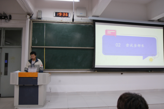 首先由王泽阳进行学生会工作经验分享,此心向阳——化三载之成长,工学生会辉煌,主要讲述了自己在学生会三年的心路旅程与成长。随后,易凡老师进行总结,讲述了自己与化工学生会之间的羁绊,希望大家能够承前人之志,领跑青春!