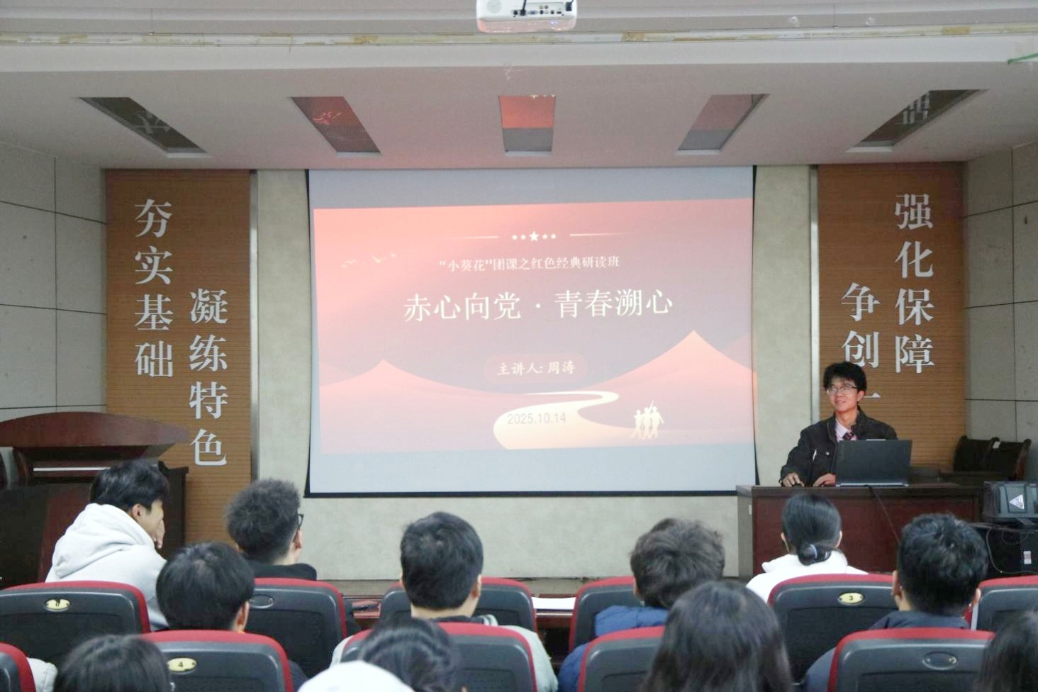 “小葵花”主题团课之红色经典研读班第三讲在J2-104开讲,此次团课的主题为“赤心向党·青春溯心”,由里番