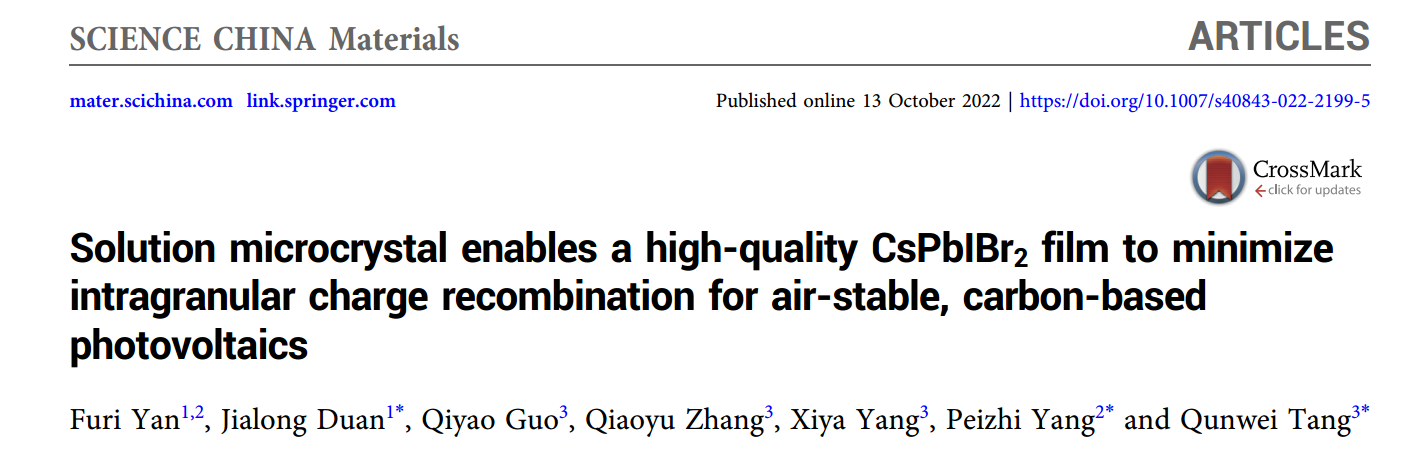 段加龙副教授(学术教授)在全无机钙钛矿太阳能电池领域取得最新进展,相关成果以“Solution microcrystal enables a high-quality CsPbIBr2 film to minimize intragranular charge recombination for air-stable, carbon-based photovoltaics”为题发表在国产旗舰期刊SCIENCE CHINA Materials上(中科院Top一区)。