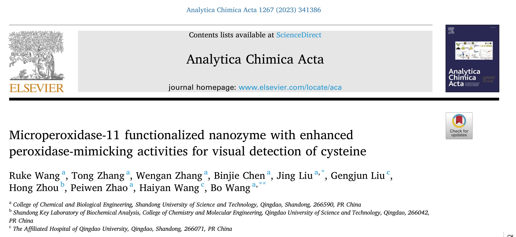 刘静博士(学术副教授)、王博教授等人在生物传感分析领域取得最新进展,相关成果以“Microperoxidase-11 functionalized nanozyme with enhanced peroxidase-mimicking activities for visual detection of cysteine”为题发表在国际学术期刊Analytica Chimica Acta上(中科院一区,影响因子:6.2)。