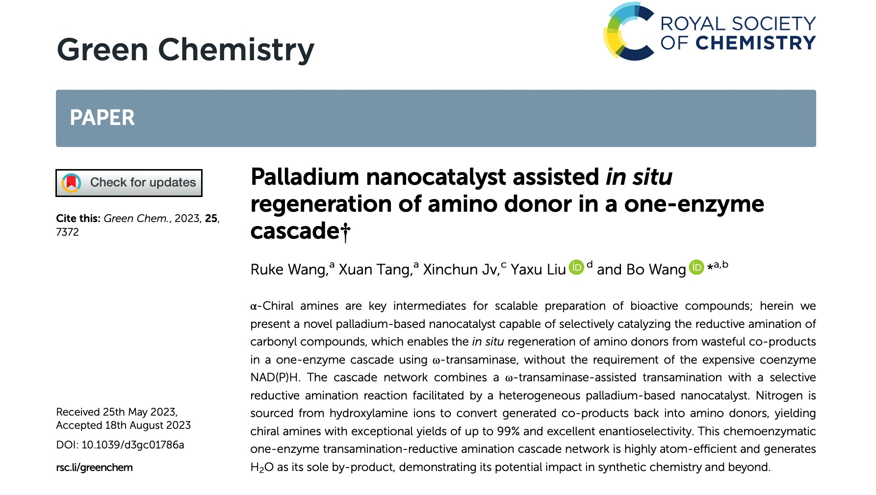 王博教授课题组在转氨酶催化的单酶催化体系领域取得最新进展,成果以Palladium nanocatalyst assisted in situ regeneration of amino donor in a one-enzyme cascade为题目发表在国际著名学术期刊Green Chemistry上,第一作者为里番