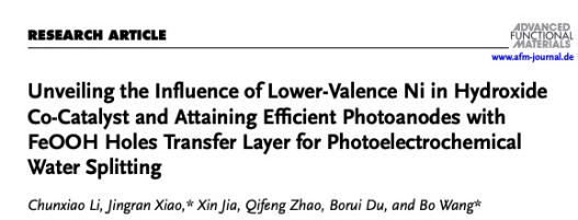 2021级硕士研究生李春晓。相关成果以“Unveiling the Influence of Lower-Valence Ni in Hydroxide Co-Catalyst and Attaining Efficient Photoanodes with FeOOH Holes Transfer Layer for Photoelectrochemical Water Splitting”为题发表在国际知名学术期刊Advanced Functional Materials上(中科院一区Top,影响因子:18.5)。